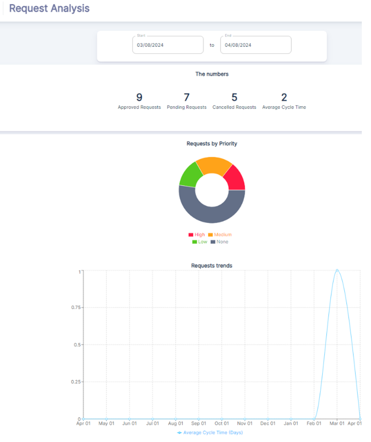 - Average Cycle Time: The average duration from the creation of a request to its completion or approval.