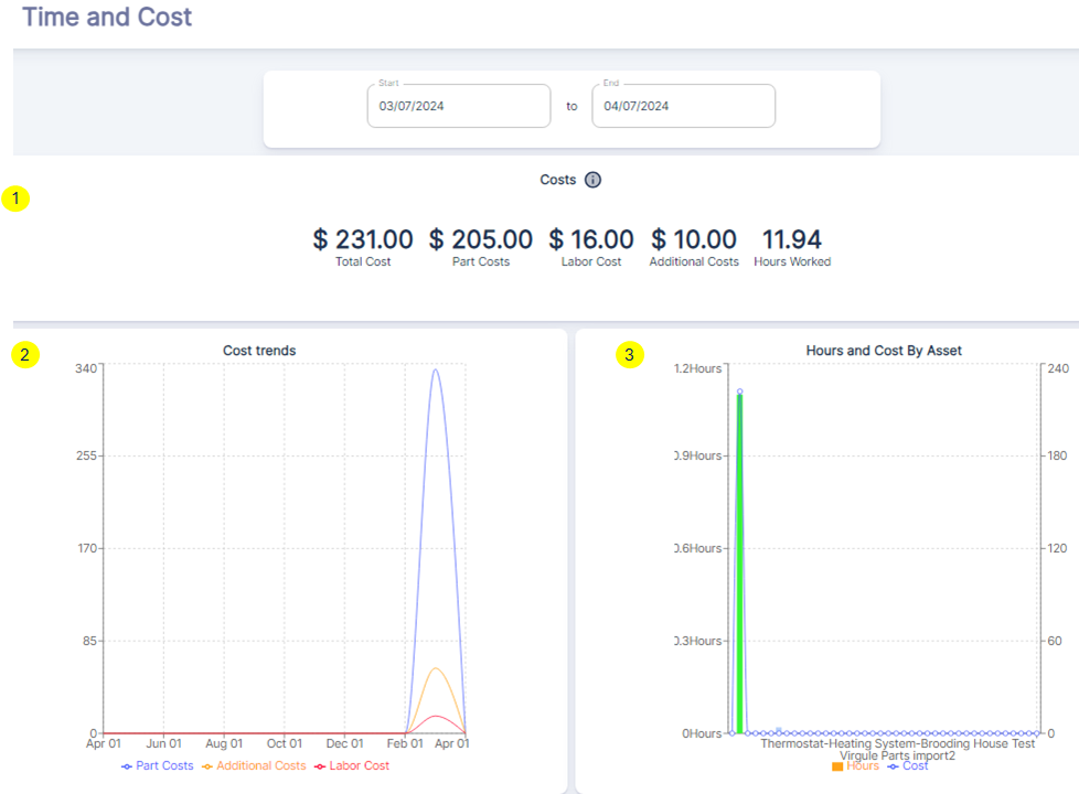 Hours and Cost By Assetgraph to determine which assets are the most cost-intensive and may benefit from targeted maintenance strategies or replacement. - Performance Analysis: Compare the costs and hours worked across different assets or time periods to evaluate the effectiveness of maintenance practices and identify areas for improvement.