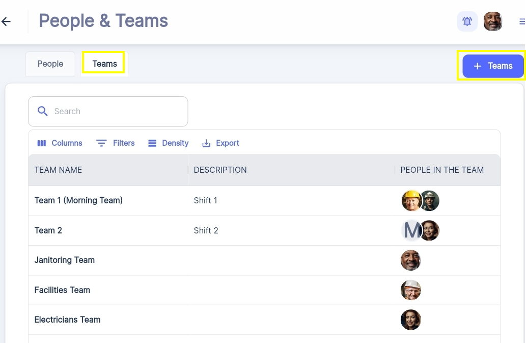 Under "Teams" tab within the "People & Teams" section, you can view all the existing teams, their descriptions, and the members assigned to each team.