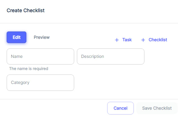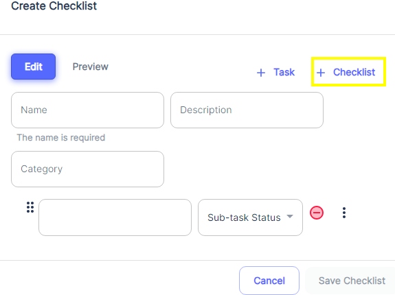 - Enter a descriptive "Name" for the new checklist in the provided field. This is a required step.
