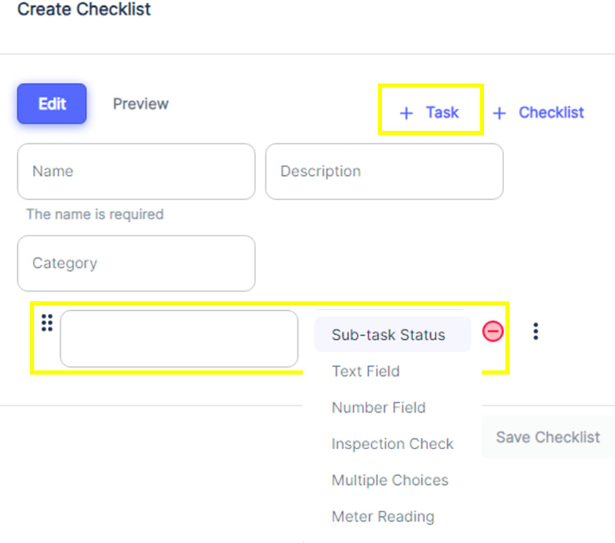 To add tasks or steps to the checklist, click the "+ Task" button, as highlighted in the third image.3 This will allow you to define the specific actions, inspections, or data points that need to be captured as part of the checklist.