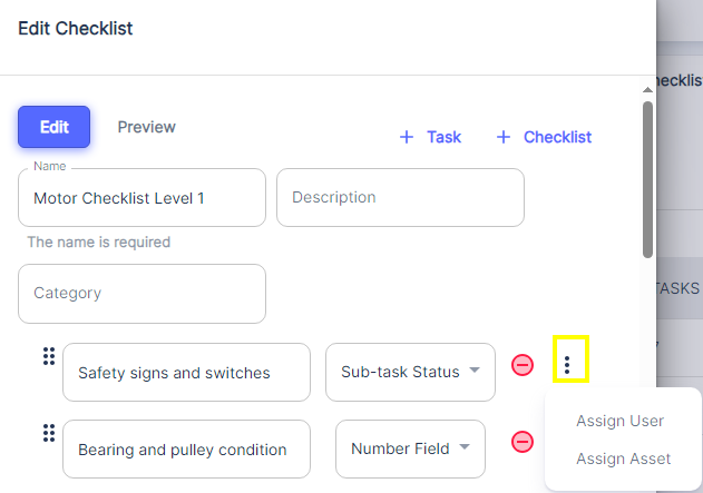 For certain tasks within the checklist, you may want to assign a specific user or asset for accountability. To assign users or assets to specific Tasks, the user needs to click on the three vertical dots icon as shown above.