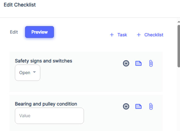 You can mix and match these task types within a single checklist to comprehensively document all required maintenance activities.