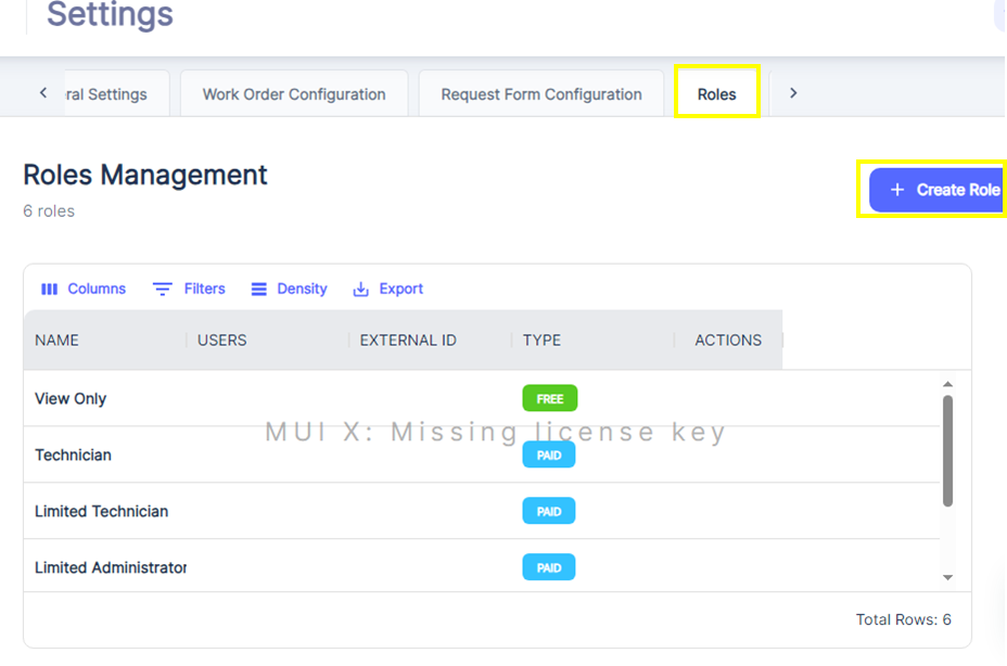 In addition to the pre-configured default roles like Admin, Technician, Requester etc., explained in previous chapter xxx, ATLAS CMMS provides a robust roles management system that allows administrators to define and customize user roles according to their organization's specific requirements. The Roles Management screen, accessible from Settings > Roles, displays all currently configured roles within the system.