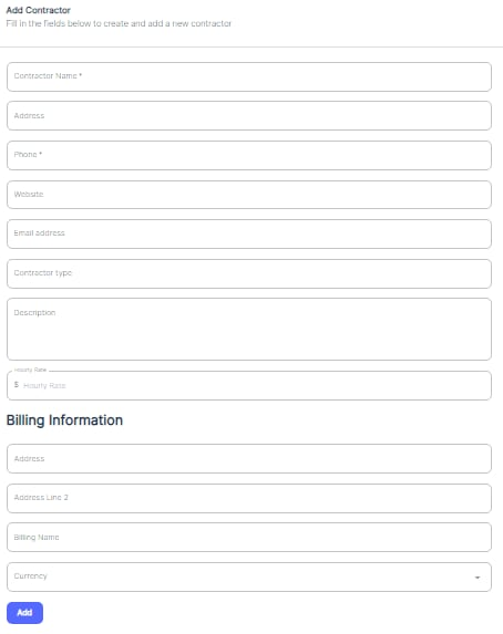 This form captures information such as the contractor's name, address, phone, website, email address, contractor type, description, and hourly rate. Additionally, it includes a section for billing information, where users can provide the billing address, billing name, and currency. Once all the necessary details are entered, clicking "Add" will create the new contractor record within the system.