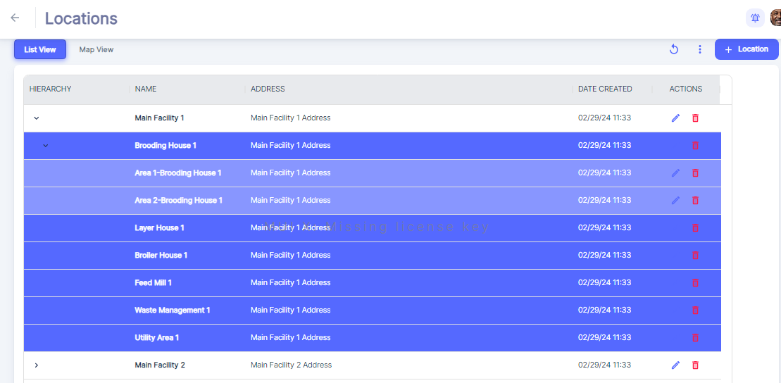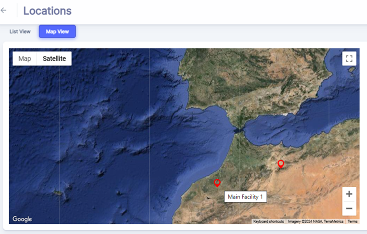 To view details about a specific location, simply click on the corresponding row or On Label on Map. This action will take you to a detailed view of the location, where you can access various tabs related to the facility's management.