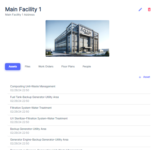 - Assets Tab: This tab lists all assets associated with the location. Each asset is timestamped, indicating its creation date. This view allows you to monitor the status and maintenance history of each asset within the facility. You can continue to view Asset details by clicking on related row.