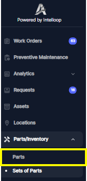 To access the Parts/Inventory module, navigate to the left-hand menu and click on the "Parts/Inventory" option, as shown in the first screenshot, then “Parts”