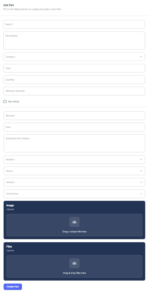You can also assign the part to specific workers, teams, vendors, or contractors using the respective dropdown menus. Additionally, you have the option to upload an image of the part and any relevant files or documents (e.g., manuals, specifications) by dragging and dropping or browsing for the files.