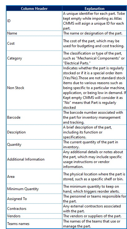 The template for Parts import can be downloaded from the Atlas CMMS website or directly from the CMMS interface. To download the template: