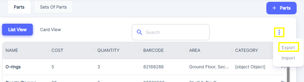 *Click on the three vertical dots at the right side of the Parts management interface.