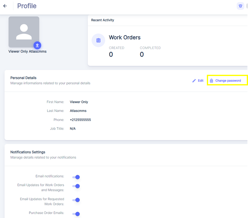 Change password button in the Personal Details section under Your Account Profile Tab. This will open a new window or form where you can enter your current password, followed by your new password and a confirmation of the new password.