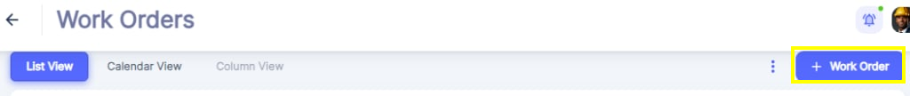 1-click on the "+ Work Order" button located at the top right corner of the interface.