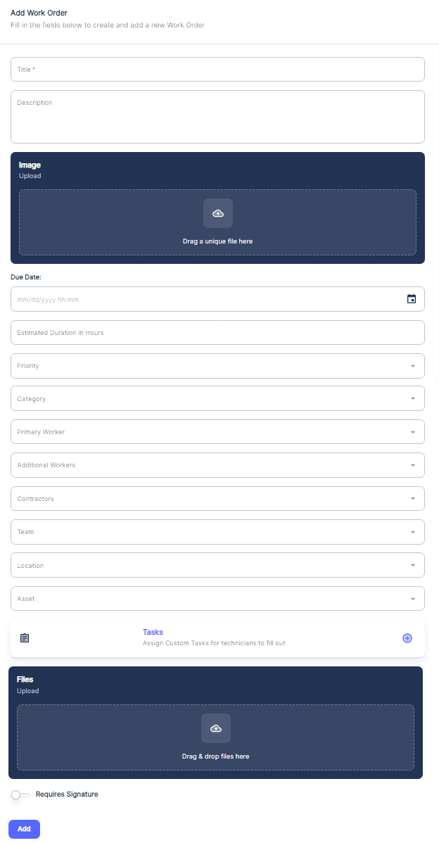 - Files Upload: Similar to the image upload section, you can attach relevant files, documents, or manuals to the work order by dragging and dropping or browsing for the files.